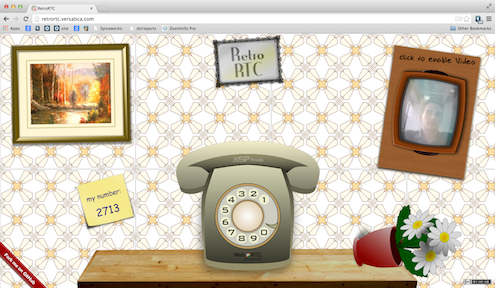 RetroRTC, a WebRTC-powered SIP video chat, incorporates an "old timey" rotary phone into its interface. (It reminds us of our latest From Rotary to WebRTC Infographic!) Each user is given a four digit number that can be called by another user. A user must dial this number on the rotary phone before placing the call. The finger wheel turns slowly and dramatically for each number, and when the call is finally initiated, the user's image appears on an old school TV on the right hand side of the page (chats can also take place without video).