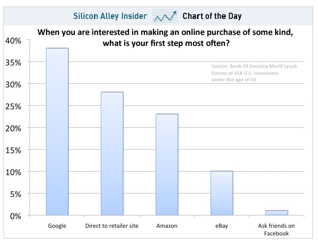 According to Business Insider’s Chart of the Day (above), almost 40% of the 418 U.S consumers surveyed said that they went to Google first when making an online purchase of some kind. Only 1% said that they asked their friends on Facebook. Google can breathe a sigh of relief; for now, consumers are not spurning traditional search to ask for advice and answers from their friends. That being said, I think +1 shows that Google is not ignoring the usefulness of a network that allows these recommendations to happen. Way to cover your bases, Google.