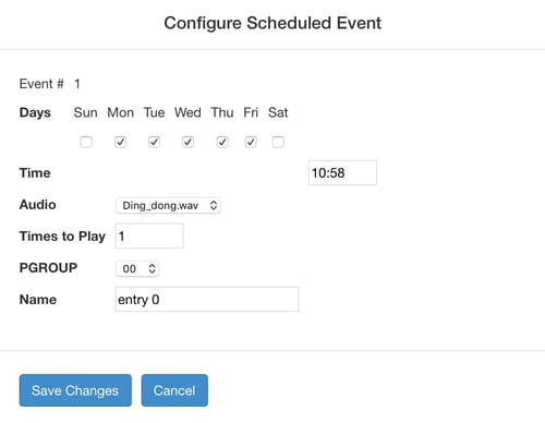 To configure a scheduled event, go to Schedules. Here, you can select the days of the week, time, audio file, the number of times you want the message to play, which paging group to assign the event to, and a name.